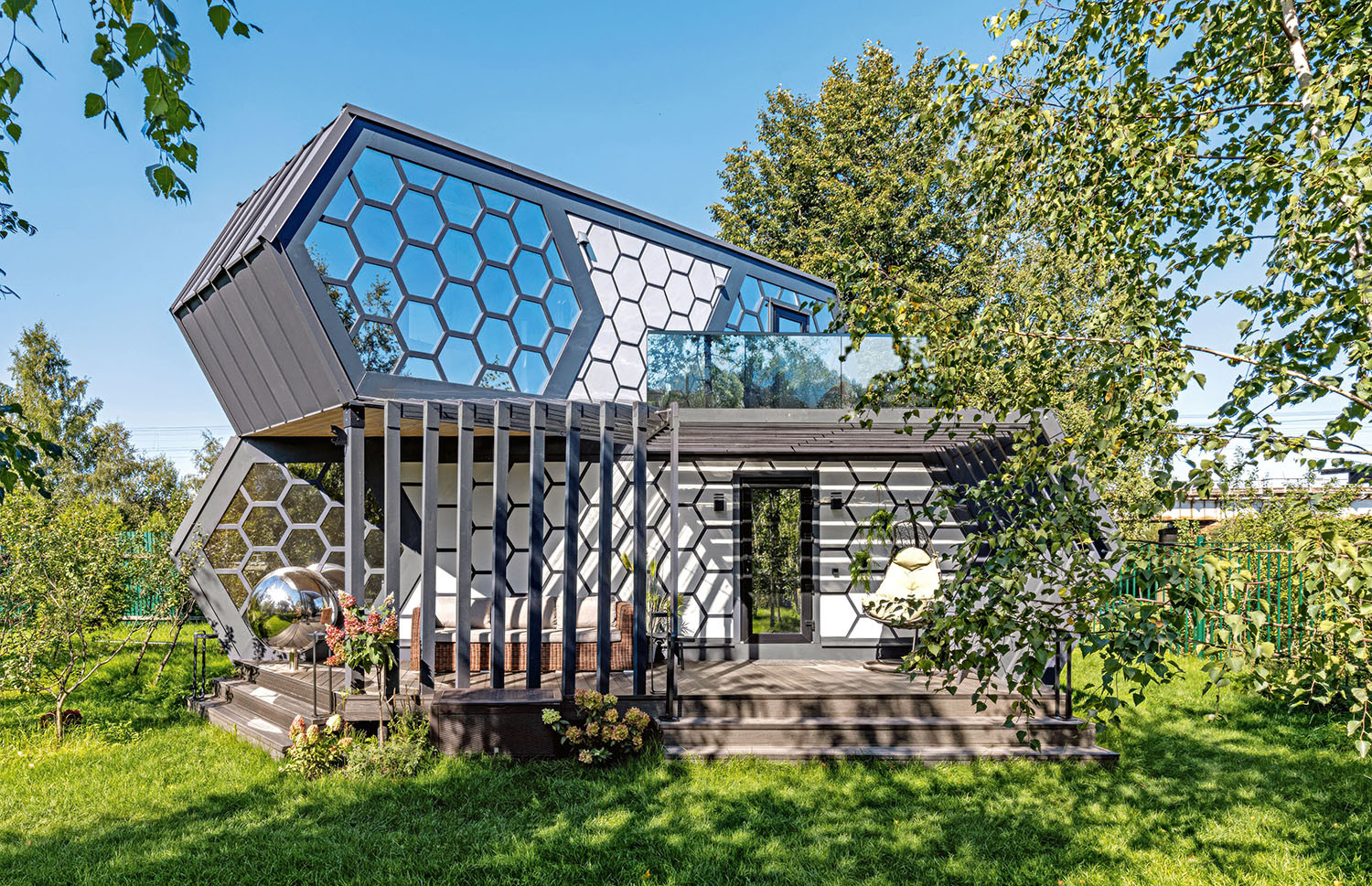 Заказчик решил, что хочет обустроить свой участок для души, чтобы был уголок, напоминающий детство: небольшой сад, пирс для лодки, компактный дом, но с креативным современным подходом. Так на берегу Москвы-реки появилась эта необычная постройка с запоминающимися формами и геометрическим орнаментом в виде сот