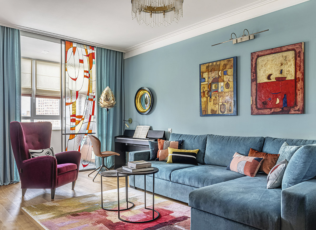 Дизайнер использовала свойство цвета влиять на восприятие пространства. Так, холодные тона подчёркивают дистанцию, поэтому крупные «элементы» расположены на «периферии»: стена за диваном, сам диван и кухонная мебель как бы отступают назад, визуально расширяя помещение