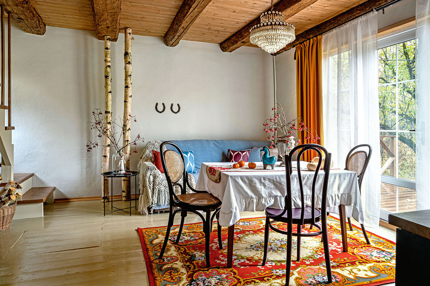 Дачу с видами на берёзовую рощу и яблоневый сад в одном из СНТ Клинского района Московской области дизайнер приобрела в качестве инвестиции, для сезонной сдачи в аренду или продажи. Красивая природа и особенности планировки дома, требующего реконструкции, навеяли гамму идей по обустройству. Винтаж, элементы русского стиля и шале, скандинавские мотивы гармонично переплелись с современными решениями, такими как панорамное остекление и открытая терраса.