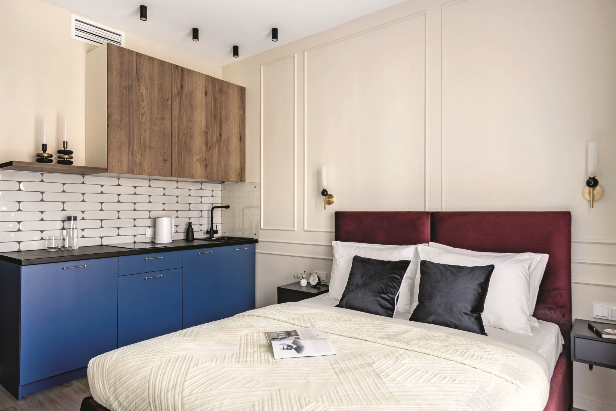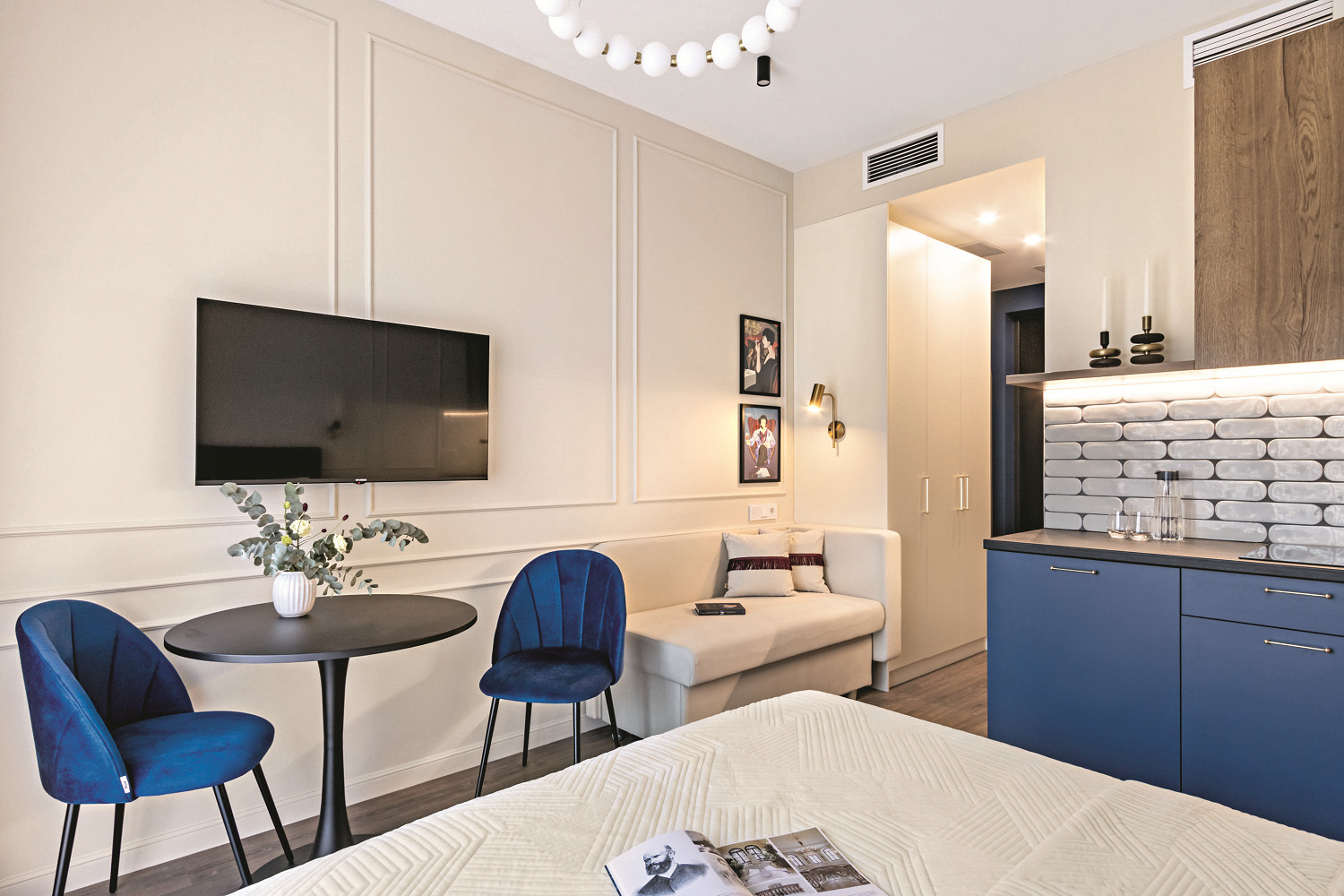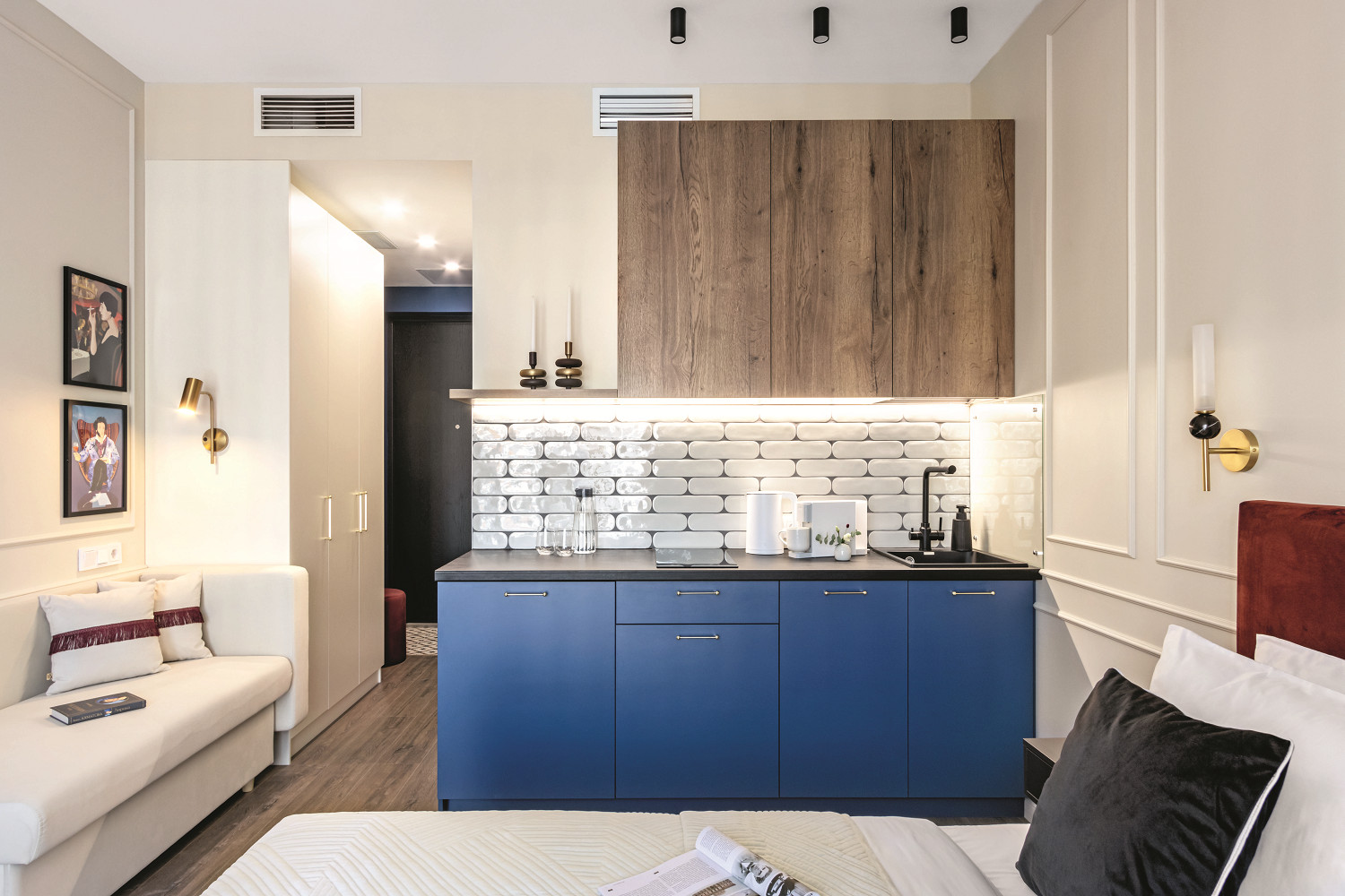 Обустройство квартиры для сдачи в аренду — задача со многими неизвестными. Дизайнер придумывает обстановку для людей, которых не знает, и не представляет их образ жизни. При этом интерьер должен быть интересным, запоминающимся, чтобы выделяться среди других предложений рынка и отвечать актуальным понятиям об удобстве и функциональности. Эта квартира в современном стиле с фрагментами неоклассики соответствует всем перечисленным требованиям. А главное, на небольшой площади удалось разместить дополнительное спальное место, места хранения и кухню с необходимой техникой.