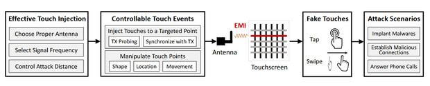 Кай Ван (Kai Wang) из Чжэцзянского университета и его коллеги из Китая и Германии разработали технологию GhostTouch, с помощью которой можно бесконтактно управлять сенсорными экранами мобильных устройств. В ее основе лежит восприимчивость емкостных сенсорных экранов к электромагнитному излучению определенной частоты.