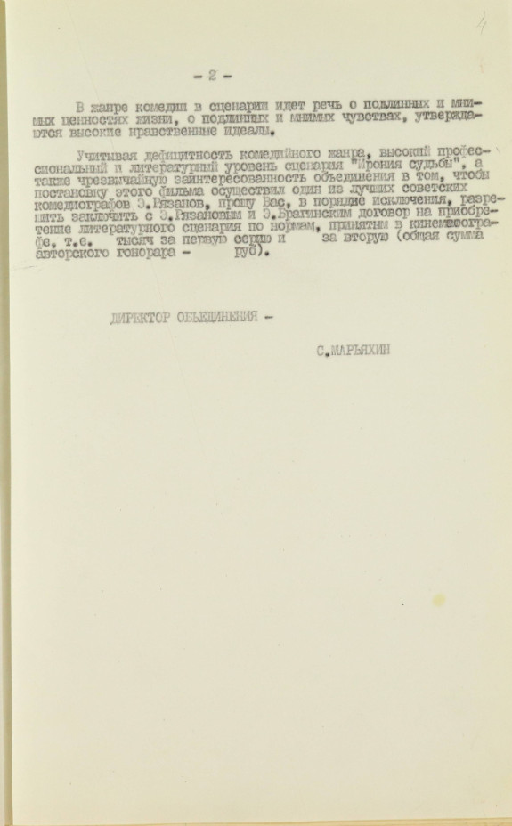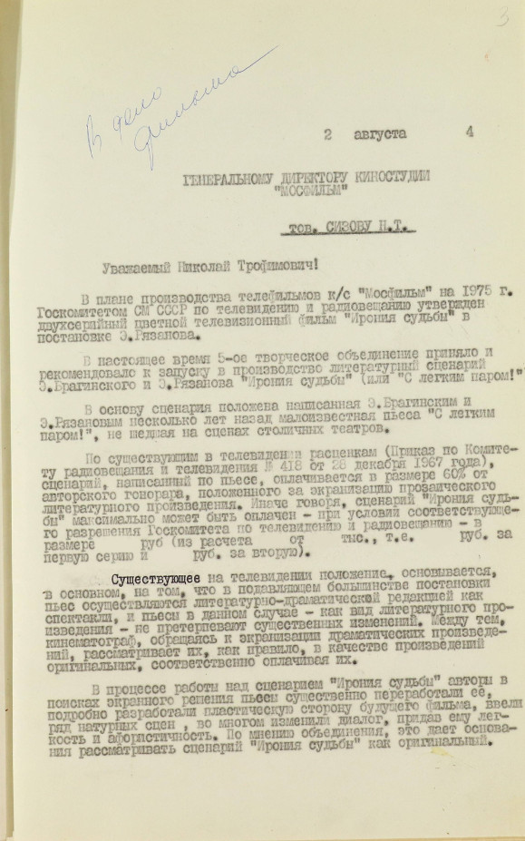 Несмотря на то что Рязанов уже успел получить статус народного любимца, проблем с запуском картины было очень много. Вечная борьба режиссеров со студиями, министрами культуры и председателями околокинематографических ведомств имела место и в этой истории: обратившись на «Мосфильм» и в Госкино, режиссер получил категорические отказы — никто не видел смысла вкладываться в комедию, еще и двухсерийную. Казалось, на этом могла бы быть поставлена точка, но Рязанов решил пойти другим путем и предложил сценарий телевидению. Не последнюю роль в этом решении сыграла конкуренция и некоторая антипатия между начальниками двух ведомств: председателем Комитета СССР по кинематографии Филиппом Ермашом и председателем Комитета по радио и телевещанию Сергеем Лапиным. Для Лапина отказ от сценария кинематографистов стал лучшим подтверждением того, что проект нужно брать в производство. Так «Ирония» запустилась на «Мосфильме», в объединении телевизионных фильмов.