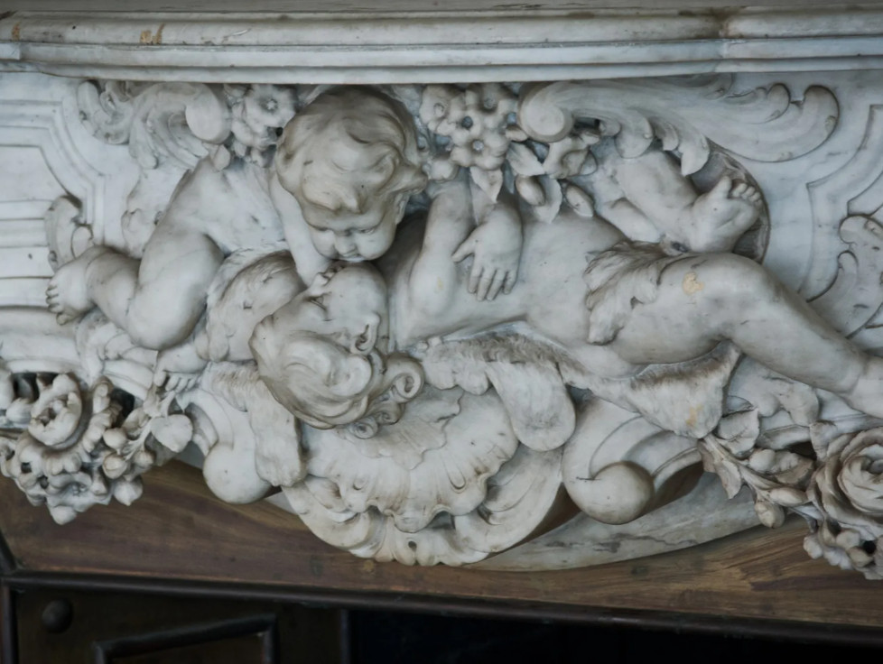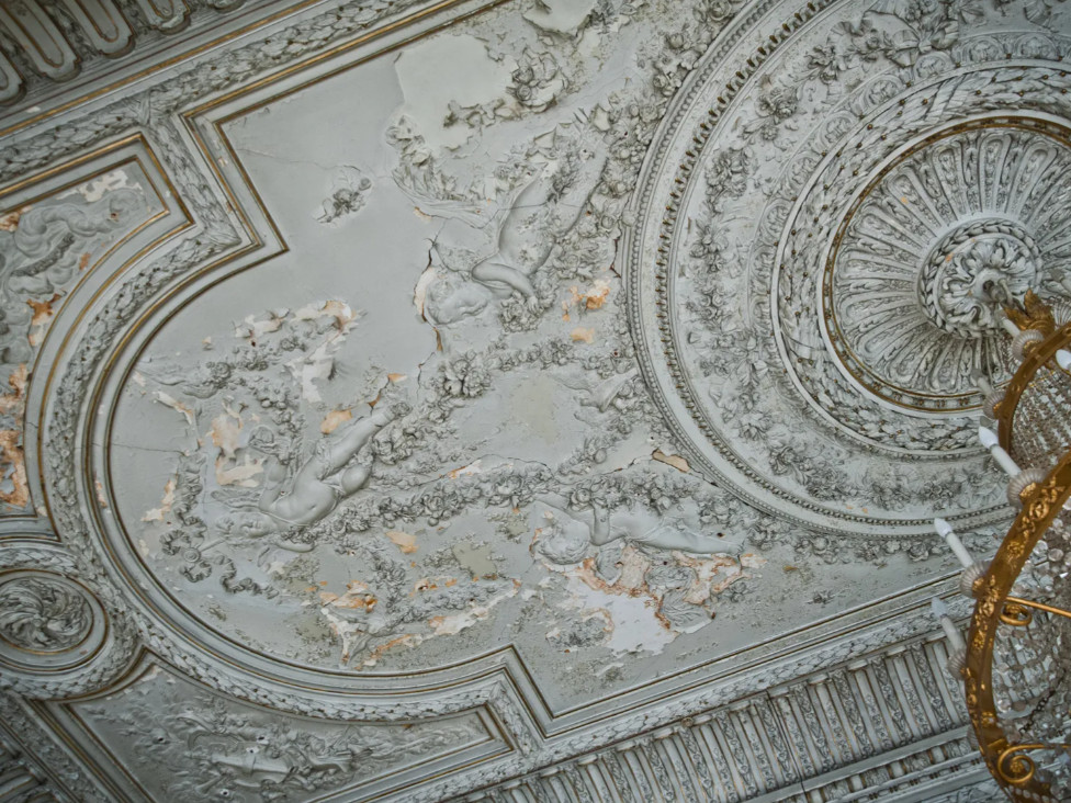 Из гостиной также можно было попасть в танцевальный зал, который называли Белым — за основной цвет отделки. Здесь архитектор придерживался французского стиля, который был популярен при Людовике XV. Стены украшала позолоченная лепнина: изображения купидонов и сатиров, вазы с цветами, венки, женские головки. Здесь сохранились люстра с хрустальными подвесками и мраморный камин со скульптурами амуров.