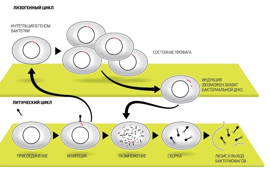 С этого момента начинается инфекционный цикл. Его дальнейшие этапы состоят из переключения механизмов жизнедеятельности бактерии на обслуживание бактериофага, размножение его генома, построение множества копий вирусных оболочек, упаковки в них ДНК вируса и, наконец, разрушение (лизис) хозяйской клетки. У каждого этапа существует множество нюансов, имеющих глубокий эволюционный и экологический смысл. Ведь бактерии и их вирусные паразиты сосуществуют сотни миллионов, если не миллиарды лет. И эта борьба за выживание не закончилась ни тотальным уничтожением одноклеточных, ни приобретением тотальной устойчивости к фагам и бесконтрольным размножением бактерий. Помимо постоянного эволюционного соревнования механизмов защиты у бактерий и нападения у вирусов, причиной сложившегося равновесия можно считать и то, что бактериофаги специализировались по своему инфекционному действию. Если имеется крупная колония бактерий, где своих жертв найдут и следующие поколения фагов, то уничтожение бактерий литическими (убивающими, дословно — растворяющими) фагами идет быстро и непрерывно. Если потенциальных жертв маловато или внешние условия не слишком подходят для эффективного размножения фагов, то преимущество получают фаги с лизогенным циклом развития. В этом случае после внедрения внутрь бактерии ДНК фага не сразу запускает механизм инфекции, а до поры до времени существует внутри клетки в пассивном состоянии, зачастую внедряясь в бактериальный геном. В таком состоянии профага вирус может существовать долго, проходя вместе с хромосомой бактерии циклы деления клетки. И лишь когда бактерия попадает в благоприятную для размножения среду, активируется литический цикл инфекции. При этом, когда ДНК фага освобождается из бактериальной хромосомы, часто захватываются и соседние участки бактериального генома, а их содержимое в дальнейшем может перенестись в следующую бактерию, которую заразит бактериофаг. Этот процесс (трансдукция генов) считается важнейшим средством переноса информации между прокариотами — организмами без клеточных ядер.