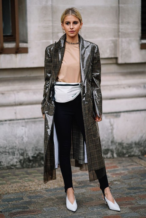 К прозрачному виниловому тренчу отлично подойдет лаконичное сочетание нюдового боди или топа, черных скинни с высокой талией, поясной сумки в спортивном стиле с (для баланса) еще одним мастхэвом сезона — белыми ботильонами на низкой шпильке.