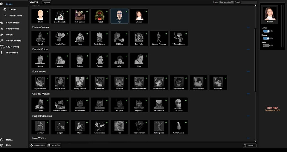 Бесплатная версия приложения тоже делится на 2 вида: обыкновенный бессрочный формат использования MorphVOX (Junior) и 7-дневная пробная версия расширенного MorphVOX PRO. В чем разница? Дело в том, что Junior-версия предполагает только 3 шаблона модификации голоса: