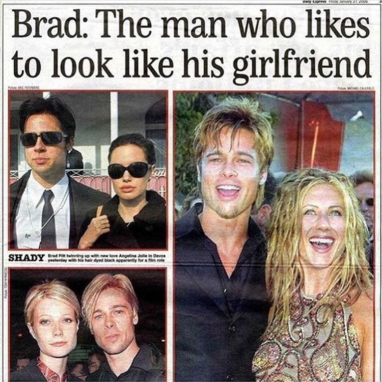 В прошлом году по интернету разлетелся скан архивного выпуска газеты Daily Express: там была опубликована статься под названием Brad: The Man who likes to look like his girlfriend («Брэд: человек, которому нравится выглядеть как его девушка»). Автор статьи собрал внушительную подборку архивных кадров Питта и его подруг — действительно, на них сходство образов было налицо.