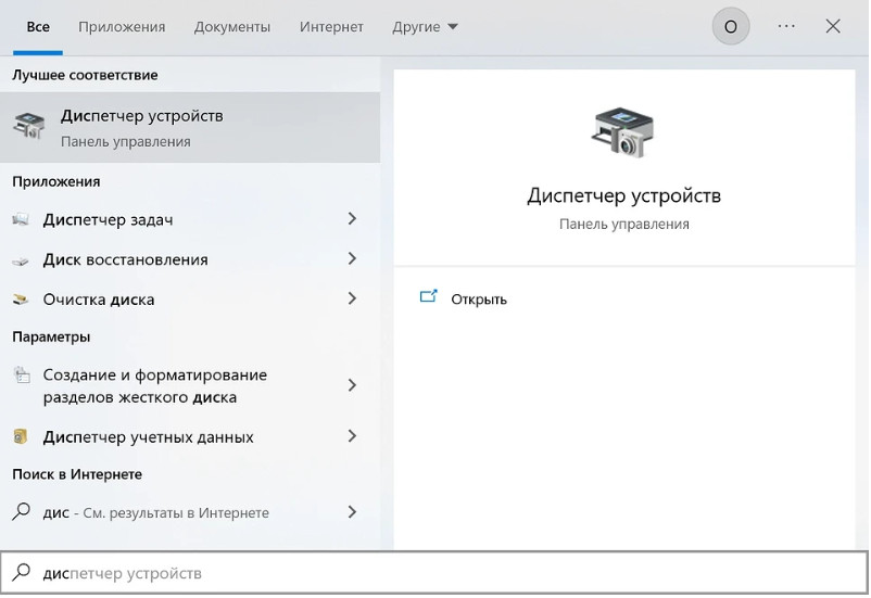 Достаточно ввести слова “диспетчер устройств” в поле поиска на панели задач (в меню “Пуск”).