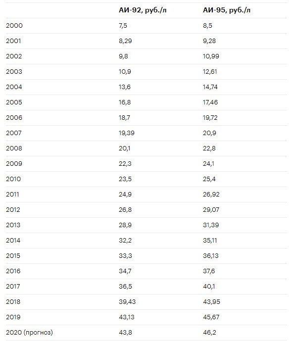 Таблица роста цен на бензин за последние 20 лет (указана средняя стоимость по стране)