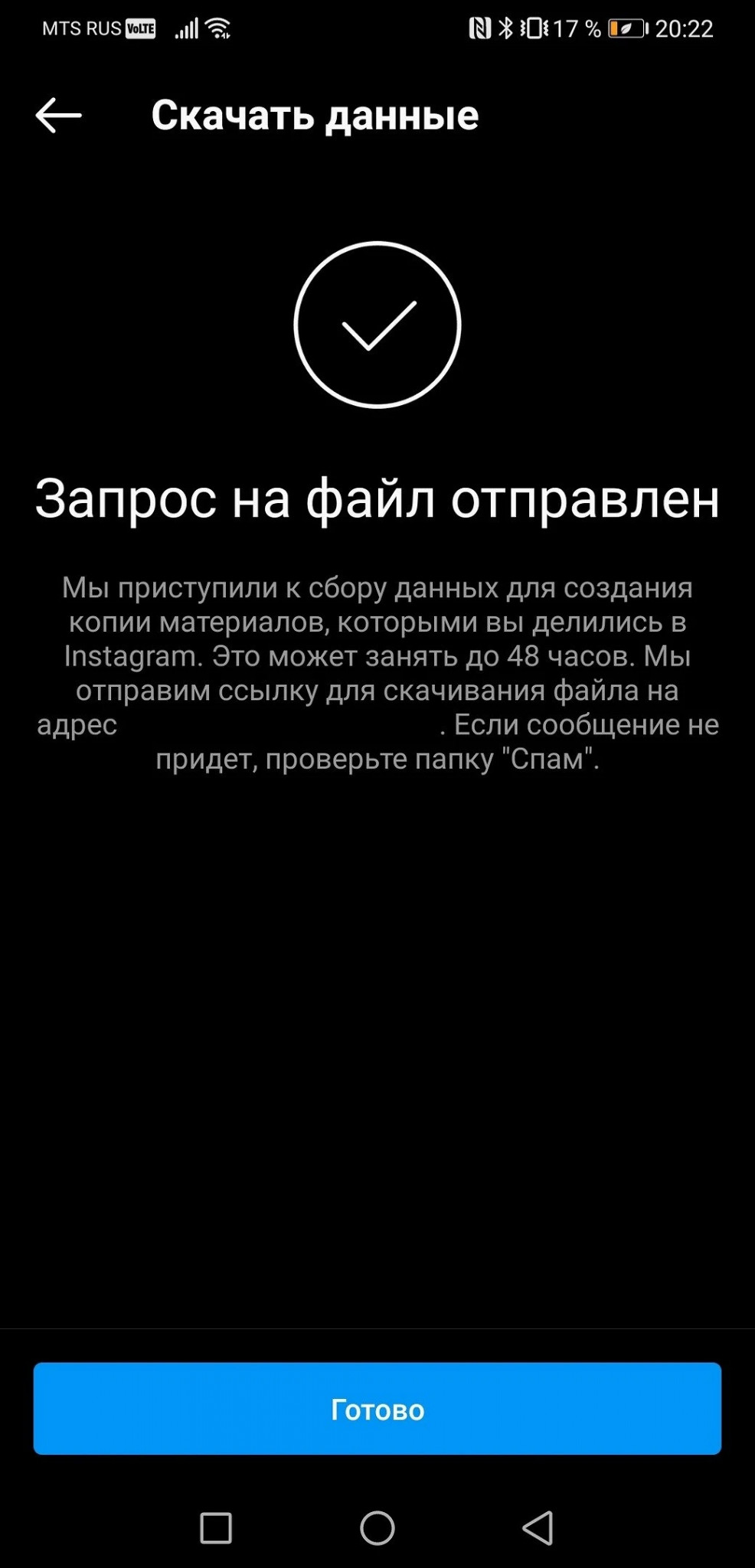 Подтвердите эти действия и ожидайте письмо со ссылкой для загрузки файлов - оно придет в течение 48 часов. В нашем случае линк прилетел в тот же вечер, что был запрошен.
