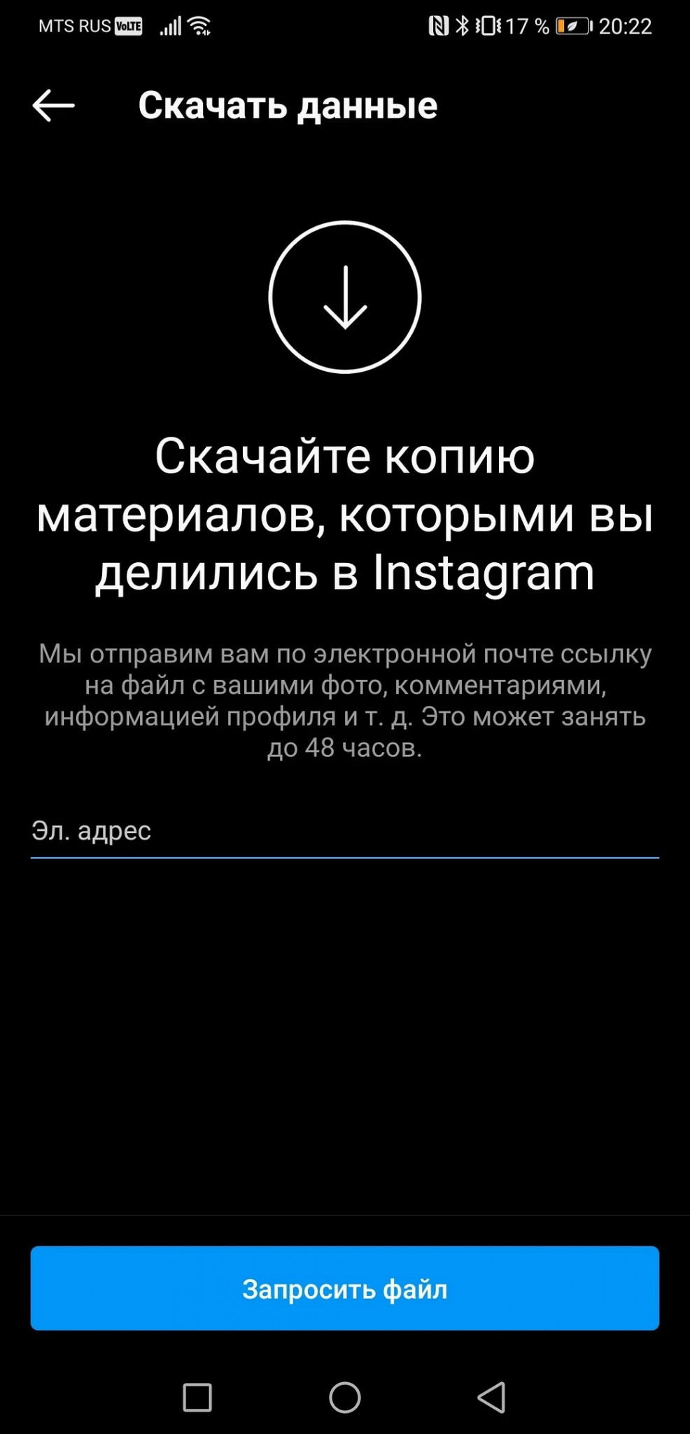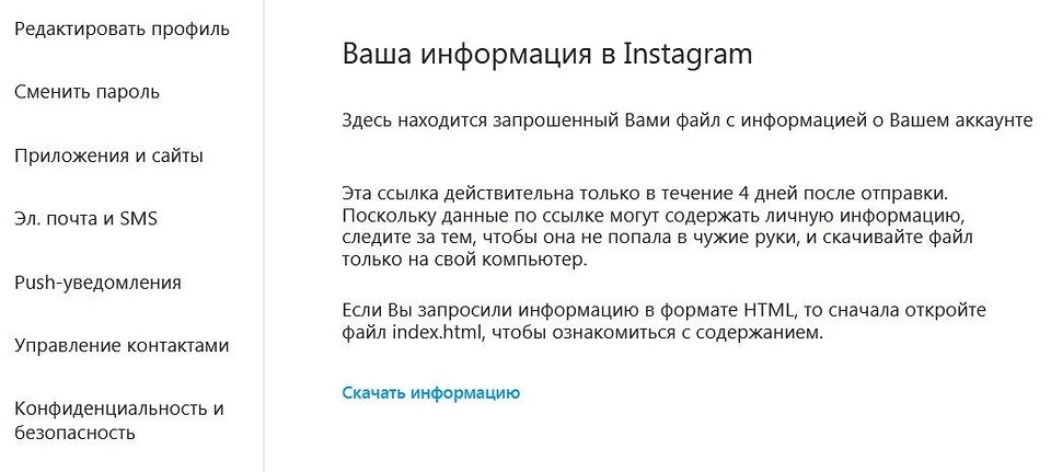 Запросить копию данных можно через приложение Instagram (соцсеть признана в РФ экстремистской и запрещена) для Android и iPhone: