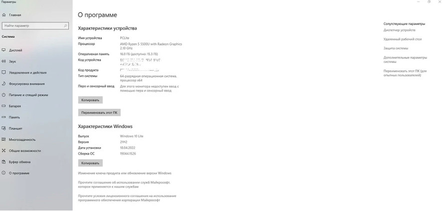 В строчке “Процессор ” мы видим название чипа, далее видим пункты “Оперативная память” и “Тип системы”.