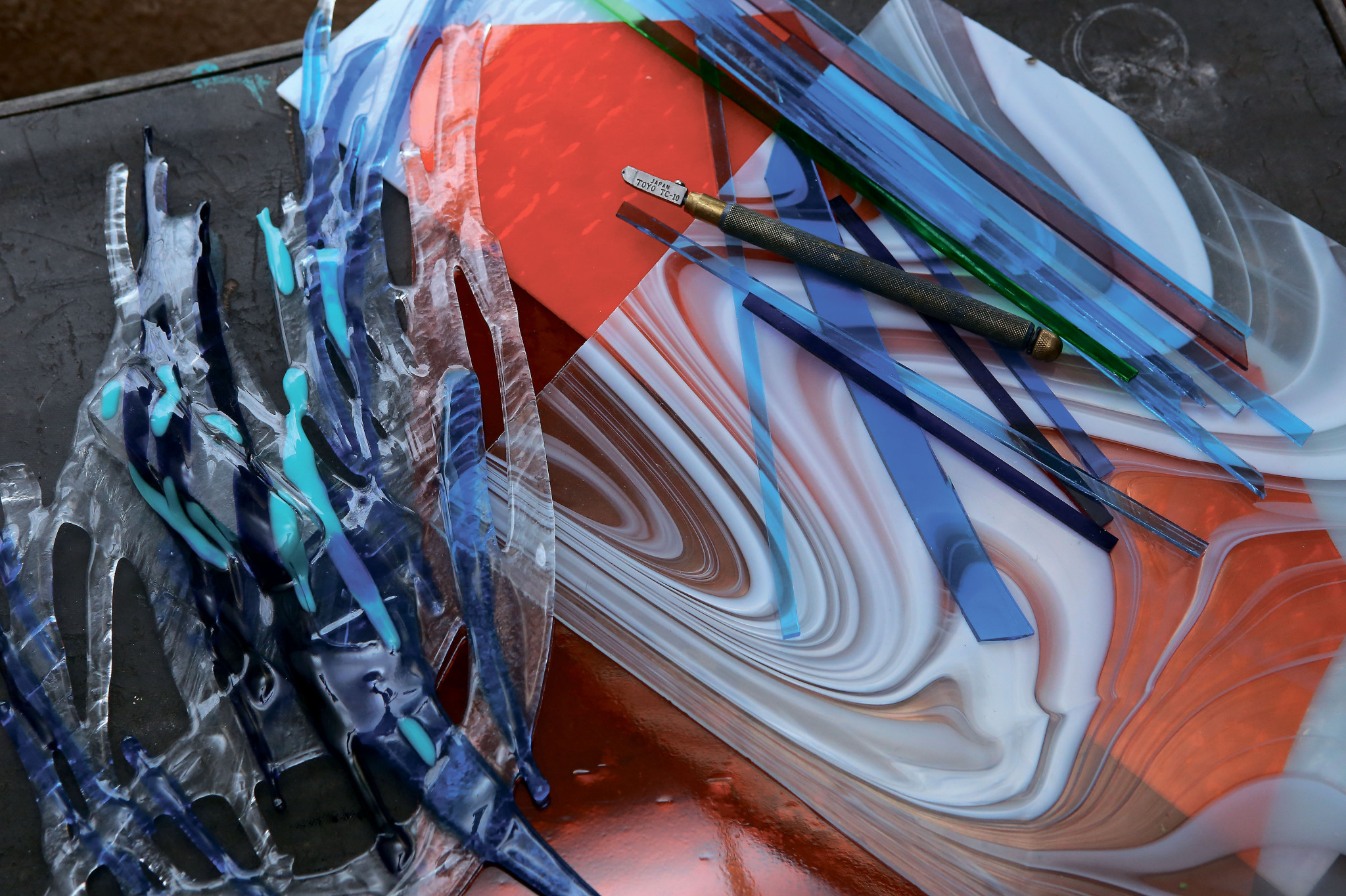 Алмазным стеклорезом мастер разрезает листы цветного стекла на полоски разной величины. Это первый шаг к будущему изделию.