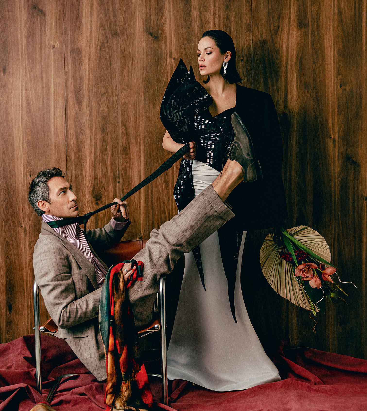 На Екатерине: платье и корсет Dashali Atelier. На Артеме: костюм, рубашка, галстук, платок — все Cerca Trova, туфли Sergio Rossi