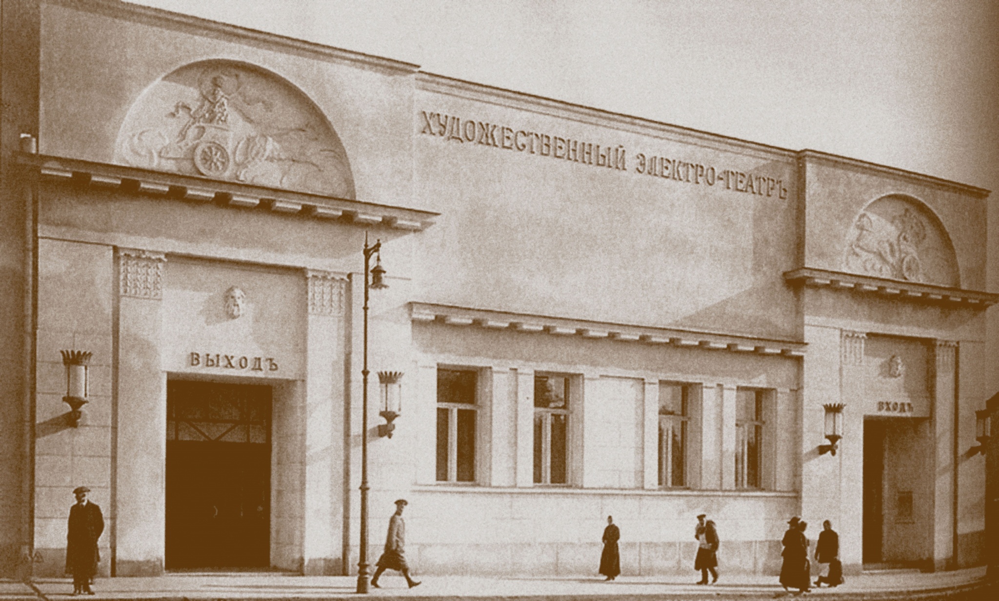 Тот вид, к которому в наше время «Художественный» возвращают реставраторы, был создан архитектором Федором Шехтелем. Он же участвовал в возведении типографии Левенсона, особняка Зинаиды Морозовой, подготовил проект для перестройки МХТ им. А. П. Чехова (и это только минимум его самых известных работ). На фасаде посетителей встречали пилястры и барельефы, – например, античные колесницы. Слева была надпись над дверью – «Выход». А слева, соответственно, –