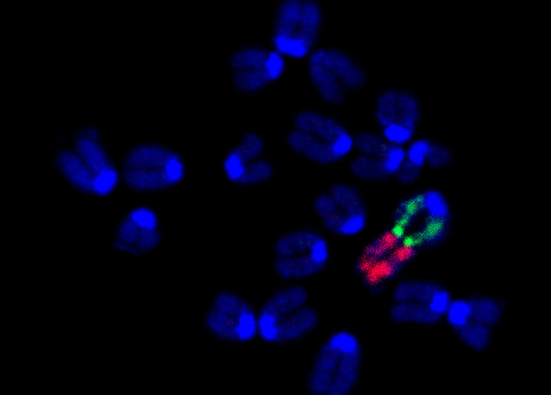 Группа ученых из Института Зоологии Китайской Академии Наук под руководством Вэя Ли (Wei Li) попробовала воспроизвести такое событие на мышах — то есть с помощью методов генной инженерии сшить друг с другом пару мышиных хромосом. Для этого им предстояло укоротить хромосомы с концов, поскольку с обеих сторон хромосомы заканчиваются теломерами. Кроме того, у мышей на одном из концов каждой хромосомы находится центромера — важная для деления структура, которая у большинства человеческих хромосом расположена в центре (мы рассказывали о них в тексте «Путешествие к центру генома»). Поэтому, чтобы приклеить одну хромосому к другой, нужно от обеих отрезать теломеру, а от одной еще и центромеру.