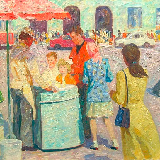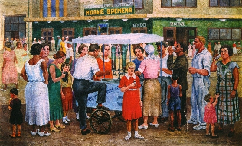 К началу XIX столетия холодное лакомство перестало быть исключительно «барской забавой», и его начали продавать на ярмарках. Литератор Павел Ефебовский писал в очерке «Петербургские разносчики»: «Мороженое продается русским мужичком в огромном ушате, наполненном льдом. Один этот ушат весит по меньшей мере пуда три; но мужичок не тужит, носит себе на голове да покрикивает: мороженое хорошо-с! А покупатели кушают, не нахвалятся... Только дорого: рюмка в три глотка стоит ни мало ни много две серебряных копейки».