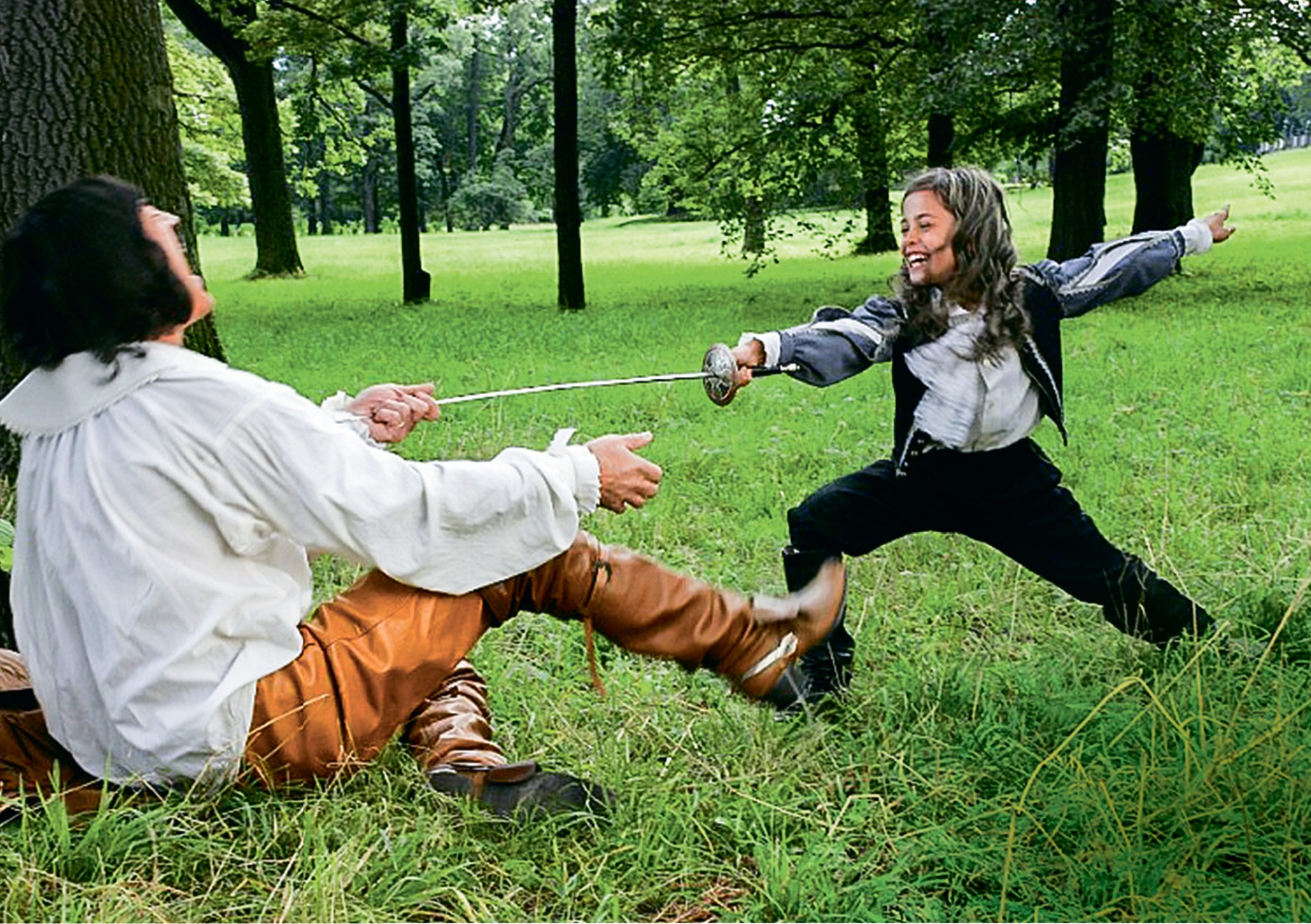 Мы очень серьезно готовились к съемкам. Я училась верховой езде, фехтованию. Съемки проходили в Санкт-Петербурге. Все для меня было новым и интересным. Я относилась ко всему не как к работе, а как к какому-то приключению. А еще мне сделали мелирование, чтобы быть похожей на Лянку Грыу, она светленькая. И для меня, маленькой девочки, это тоже было необычно. По сюжету д’Артаньян долгое время скрывал, что у него растет дочь, и воспитывал ее как сына. Поэтому на меня надевали не платья, а интересные пацанско-мужские костюмы. Моя однокурсница, дочка режиссера, тоже там снималась. Так вот у нее были красивые платья, короны. А у меня — штаны с каким-то интересным фартуком, галстук, сабля. Но у меня совершенно не было ревности, что другие ходят в платьях, а я — в костюмах.