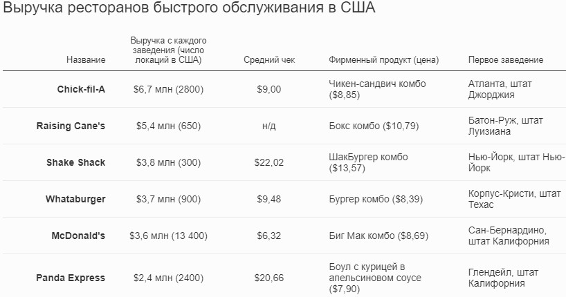 Среди 50 крупнейших американских ресторанных сетей быстрого обслуживания Panda Express занимает 12-е место по выручке в пересчете на одно заведение. Вот как выглядит первая пятерка: