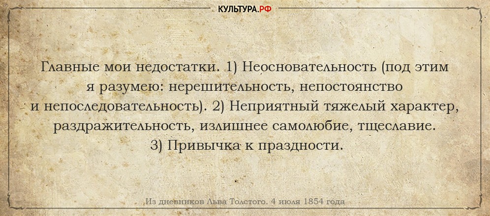 14 июля 1855 года. Может быть, я не переработаю свой характер, а сделаю только одну и важную глупость из желания переработать его. Есть ли нерешительность капитальный недостаток — такой, от которого нужно исправляться? <...> Есть недостатки абсолютные, как то: лень, ложь, раздражительность, эгоизм, которые всегда недостатки.