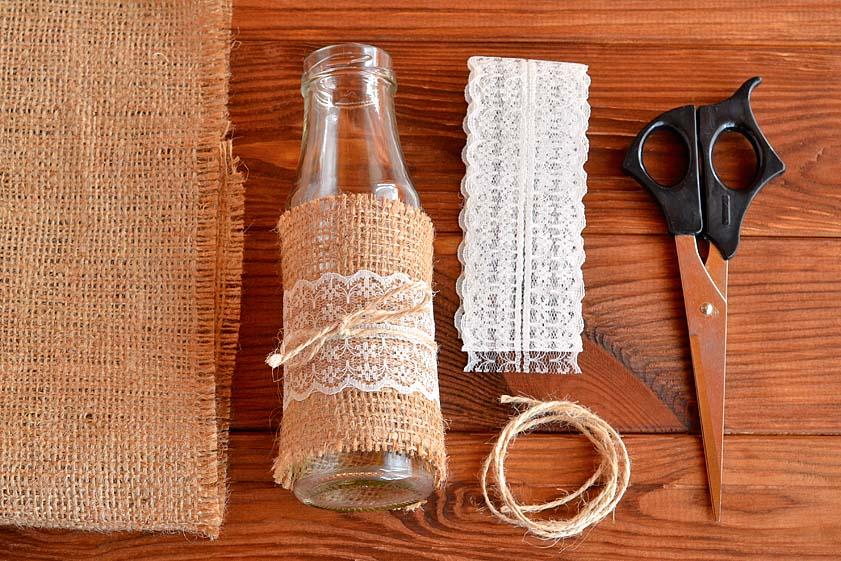 Да, это очень простая идея для супербыстрого и при этом стильного оформления. Понадобится всего кусок мешковины, а также бечевка или лента. Таким незамысловатым способом легко украсить не только вазу, подсвечник и т.д., но и любой съедобный презент – баночку с вареньем или бутылку хорошего вина.