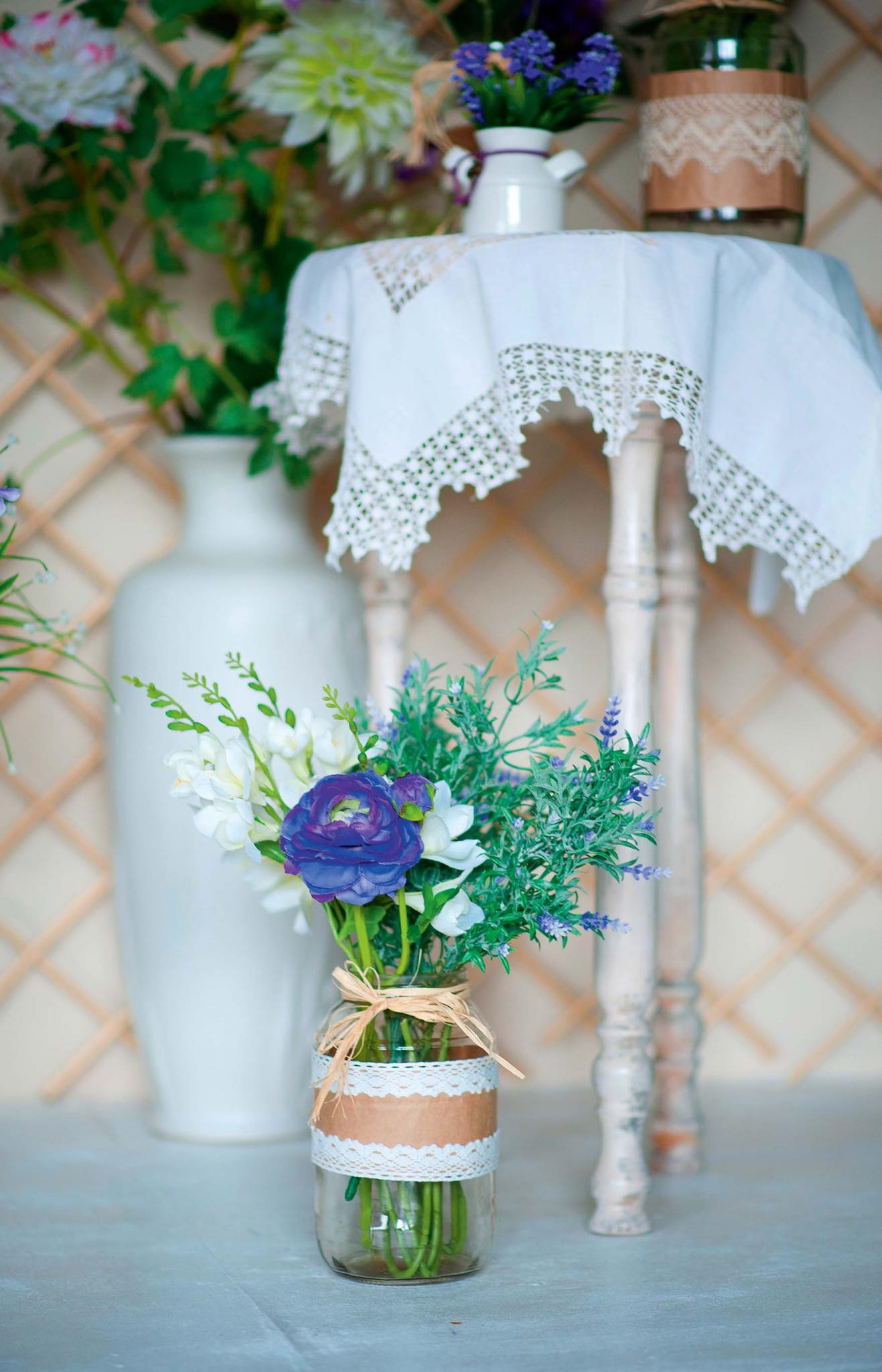 На изготовление уйдет минимум времени, а необходимые материалы есть в каждом доме. – Оберни банку кусочком крафт-бумаги и парой кружевных лент (см. на фото) – получишь вазу в стиле «прованс». – Разрежь газету или нотную тетрадь на кусочки 5Х5 см и оклей ими наружную поверхность банки клеем ПВА – отличное концептуальное решение в стиле «лофт». – Нанеси на поверхность банки клей ПВА и обмотай ее бечевкой. Готово! Можно украсить кружевом, цветком из фетра, яркими пуговицами – стиль «кантри».