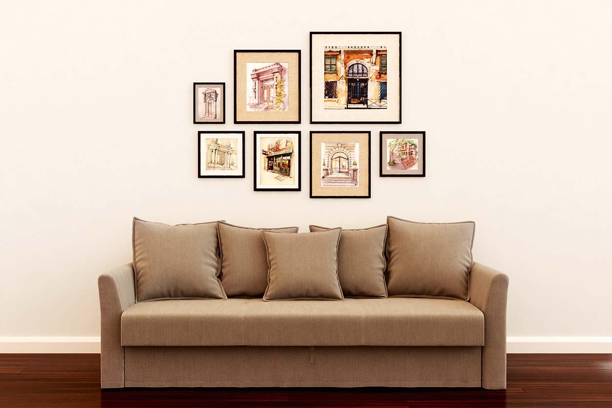 Вариант для тех, кто не хочет рисковать. Понадобится выбрать главную, самую большую рамку и дополнить ее идентичными, вписав в прямоугольник в пределах высоты главной рамки. Такая композиция хорошо подойдет для лаконичного интерьера в современном стиле и будет удачно смотреться над диваном со строгими линиями.
