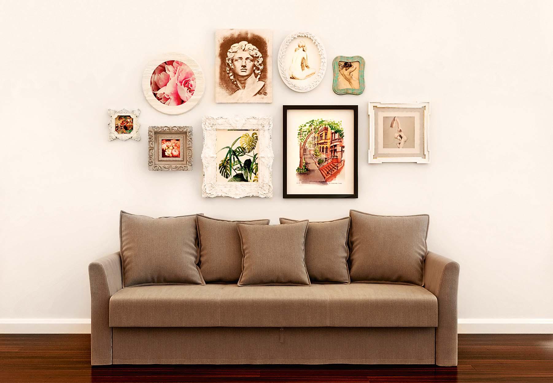 Скомпонуй багеты разного размера, стиля и формы внутри воображаемой геометрической фигуры, например, овала. Такой способ объединяет хаотично расположенные на стене рамки и привносит в интерьер ироничное настроение.