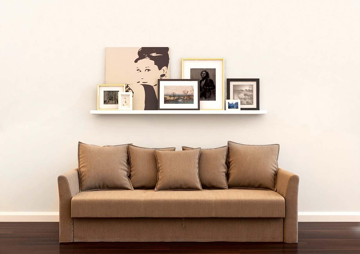 Размести рамки в одну линию на узкой полке (продаются в IKEA, от 199 руб.). Этот способ хорош тем, что ты совсем не испортишь стену и легко сможешь менять элементы композиции хоть каждый месяц. Оптимально подойдут прямоугольные и квадратные рамки в строгих и лаконичных багетах.