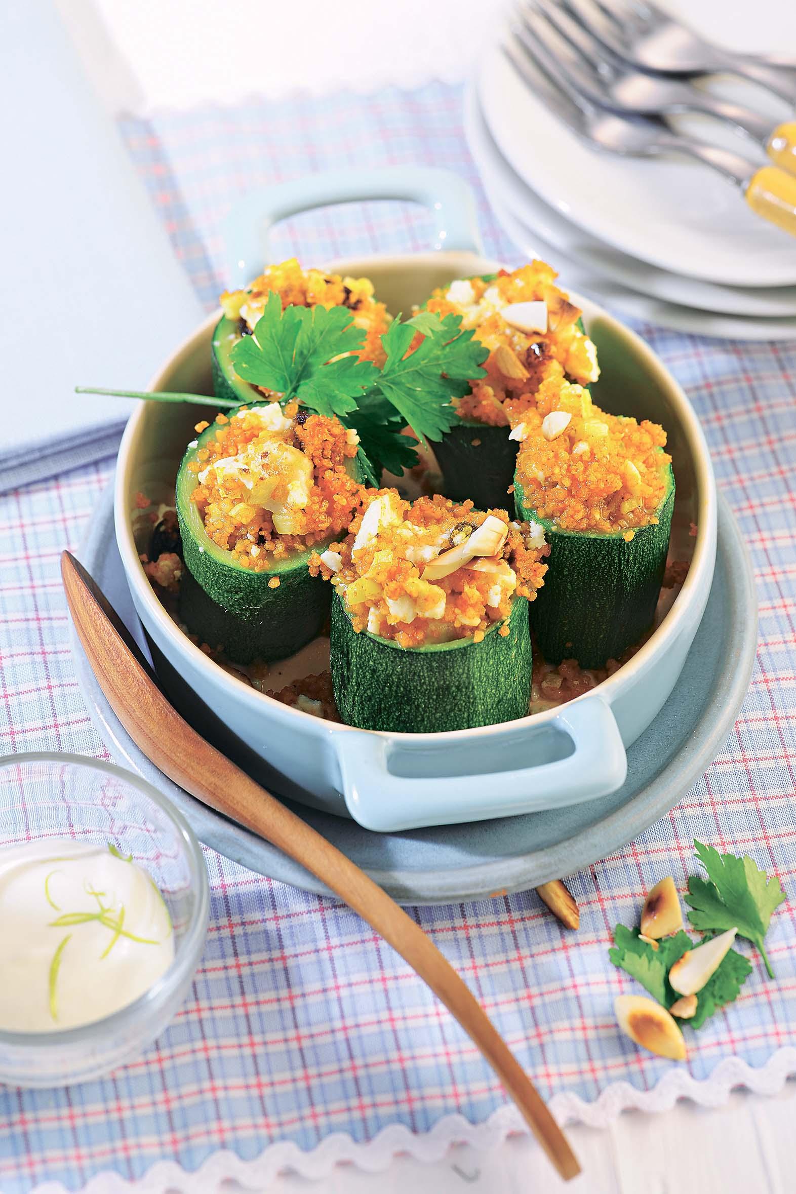 3. Духовку нагреть до 190°. Цукини вымыть и разрезать поперек на половинки. Вынуть ложкой мякоть и нарезать ее маленькими кубиками. Перемешать с приготовленной ранее смесью из кускуса, миндаля, смородины и брынзы.