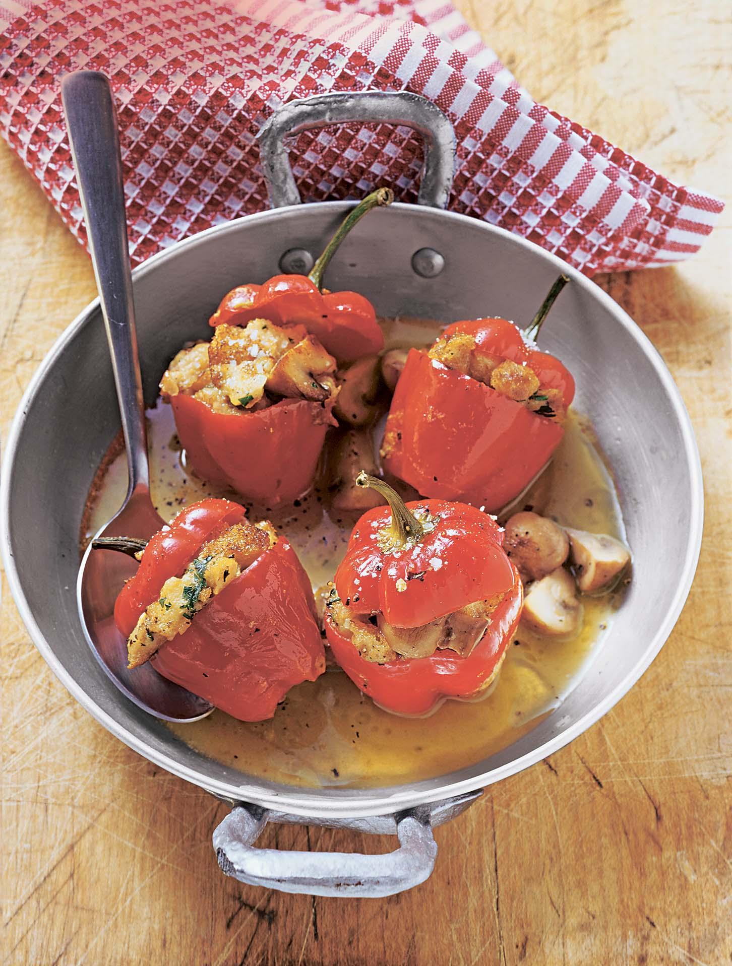 4. В форме распустить оставшееся сливочное масло и влить горячий овощной бульон. Стручки перца нафаршировать приготовленной ранее начинкой, поместить в форму, прикрыть «крышечками» и запекать 40 мин.