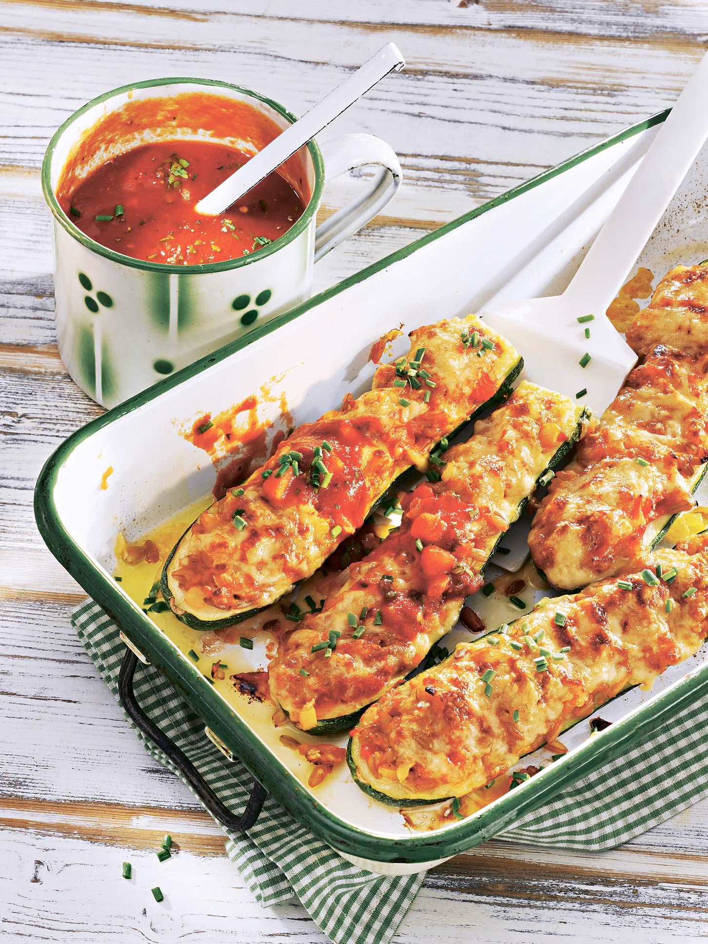 4. Каждую половинку цукини наполнить получившейся начинкой и поместить в форму. Влить оставшийся бульон и запекать 30 мин.