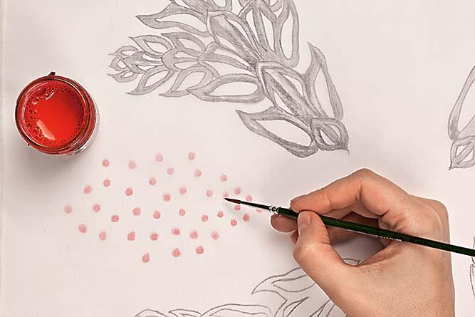 4. Чтобы оживить роспись, я решила добавить красный цвет и одним слоем нанесла точки на ткань. Роспись готова! Дай рисунку просохнуть в течение 15 минут. Полученный результат закрепи через марлю утюгом при средней температуре и без использования пара.