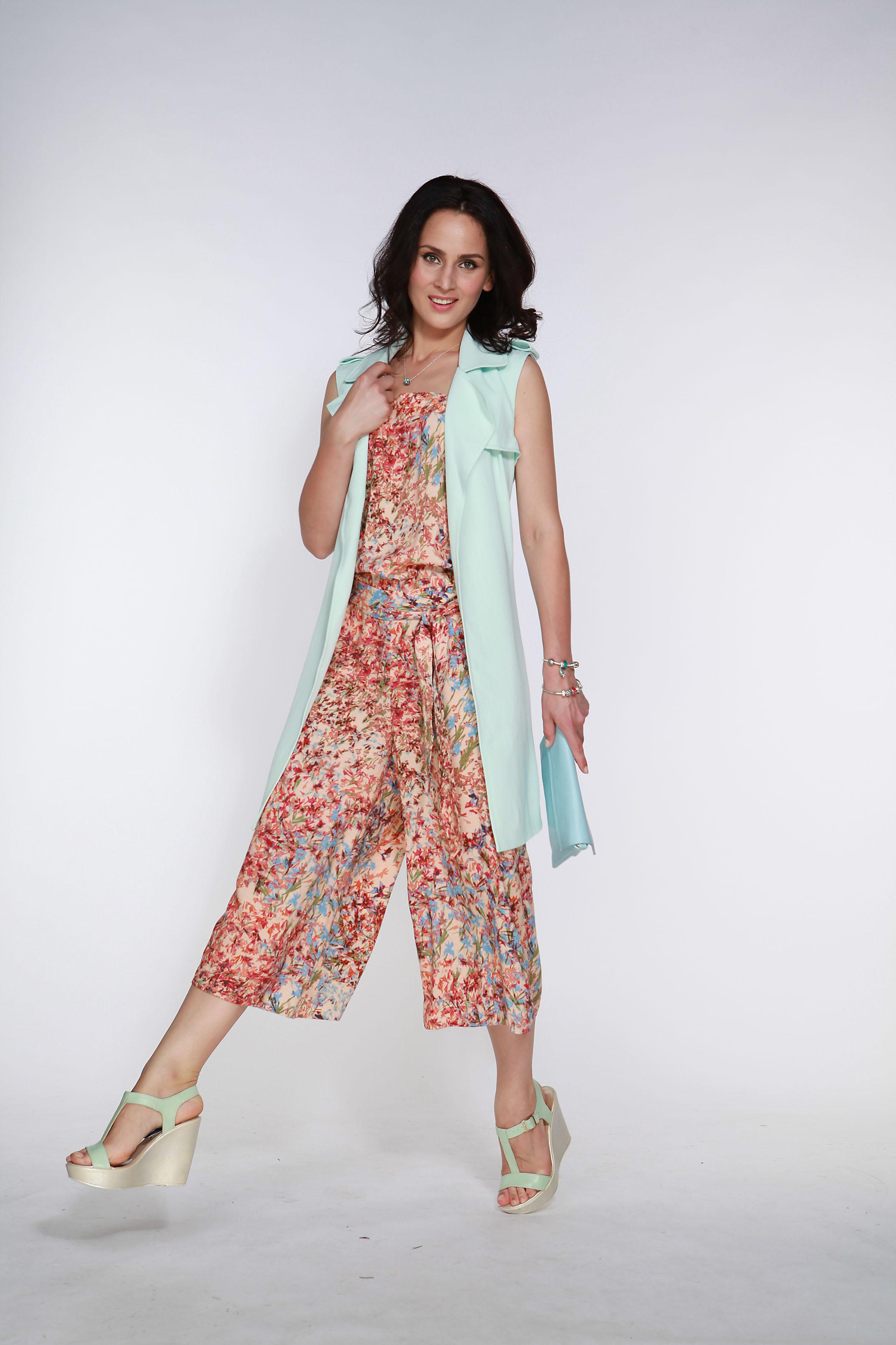 Модный комбинезон из легкой ткани с цветочным прин том пригодится на курорте. Дополни его жилетом, и сможешь трансформировать образ в более деловой. Свободный крой комбинезона, кюлоты прекрасно маскируют полноту бедер. С длиной миди обувь на танкетке добавляет несколько необходимых сантиметров роста.