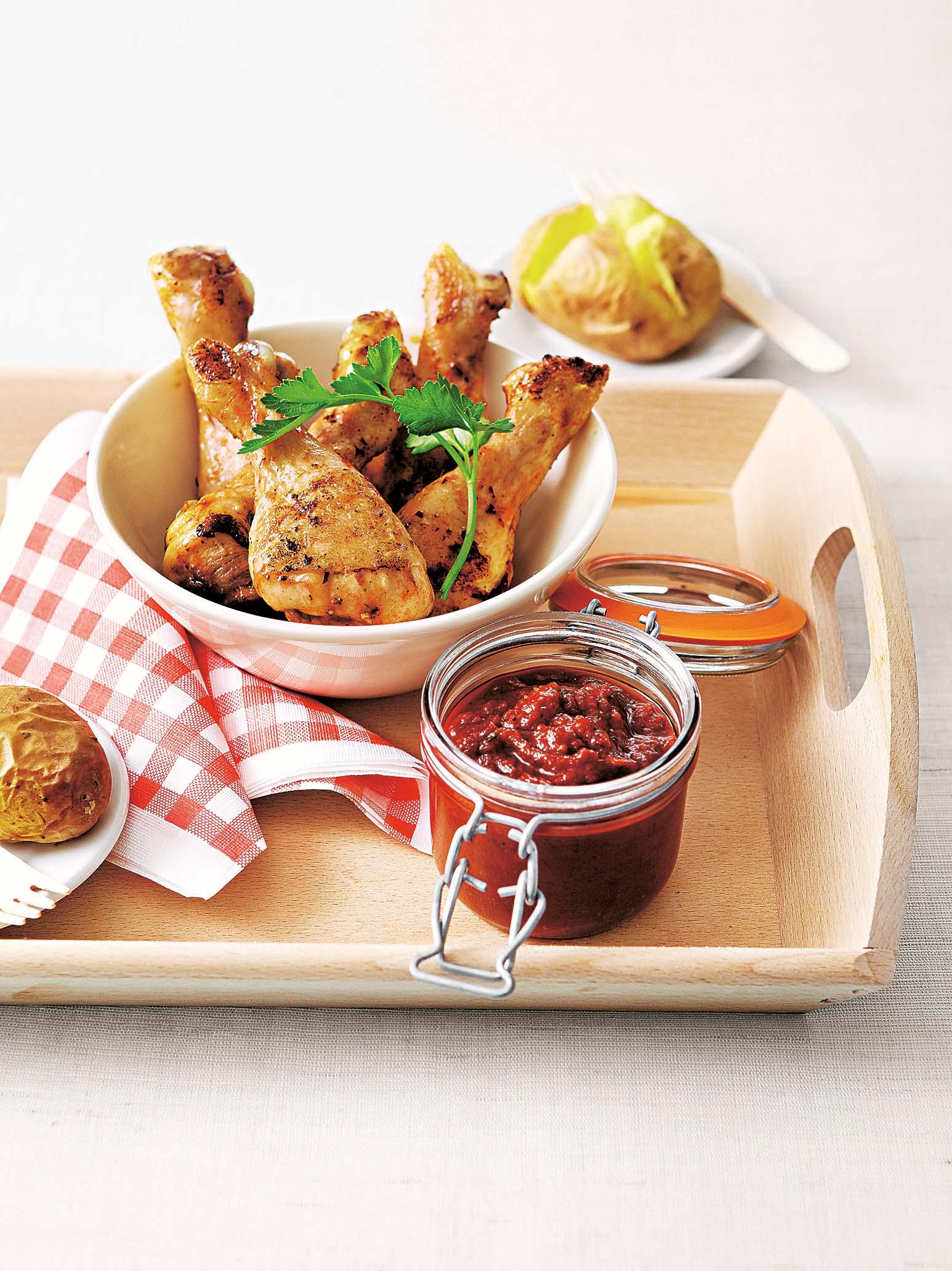 4. Куриные голени слегка обсушить и обжарить со всех сторон на гриле. На стол подать с приготовленным томатным соусом.