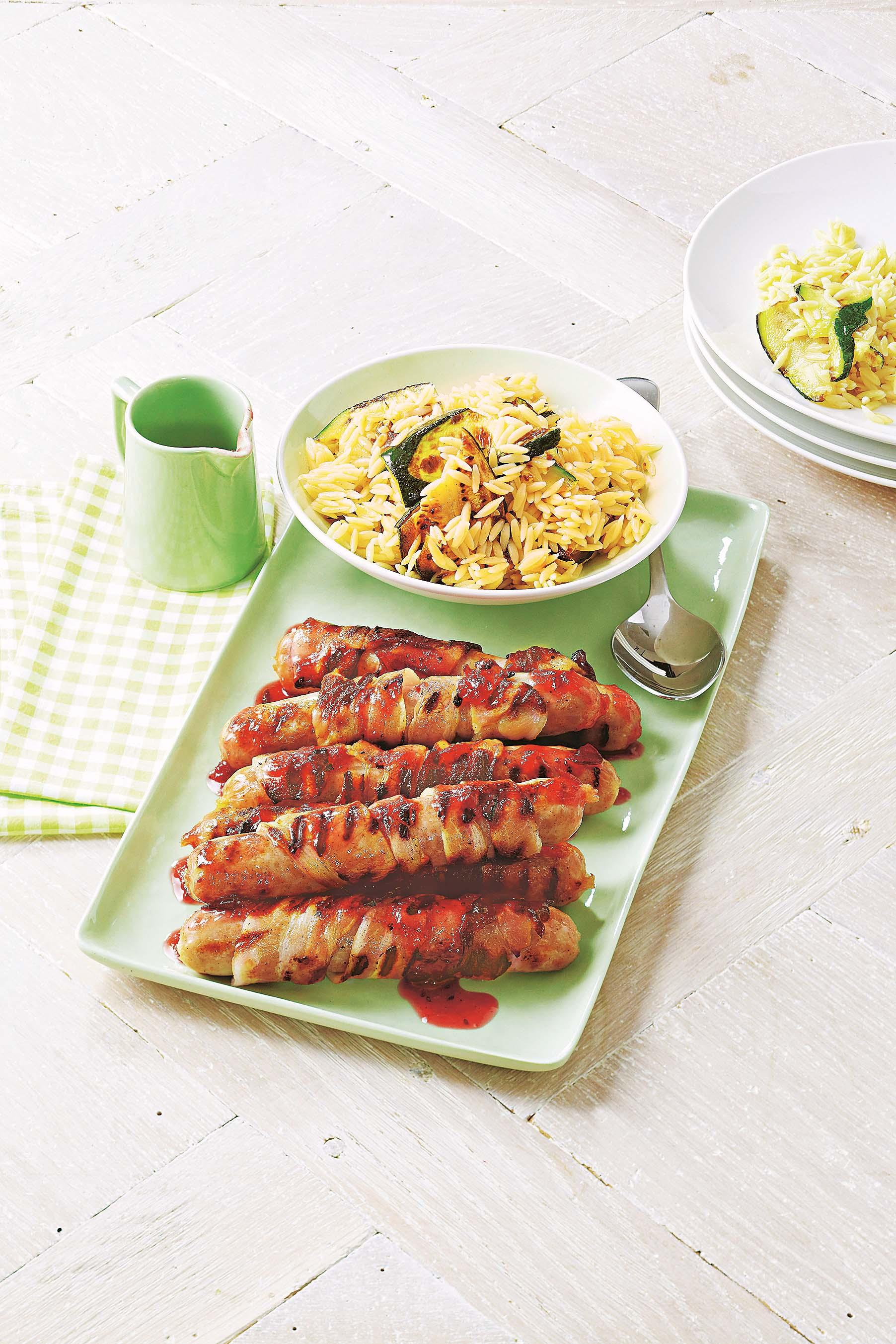 4. Чеснок пропустить через пресс и соединить с оливковым маслом. Посолить и поперчить. Приготовленной смесью полить рис и перемешать. Сверху выложить цукини. Подать к колбаскам в беконе, полив их оставшимся клюквенным соусом.