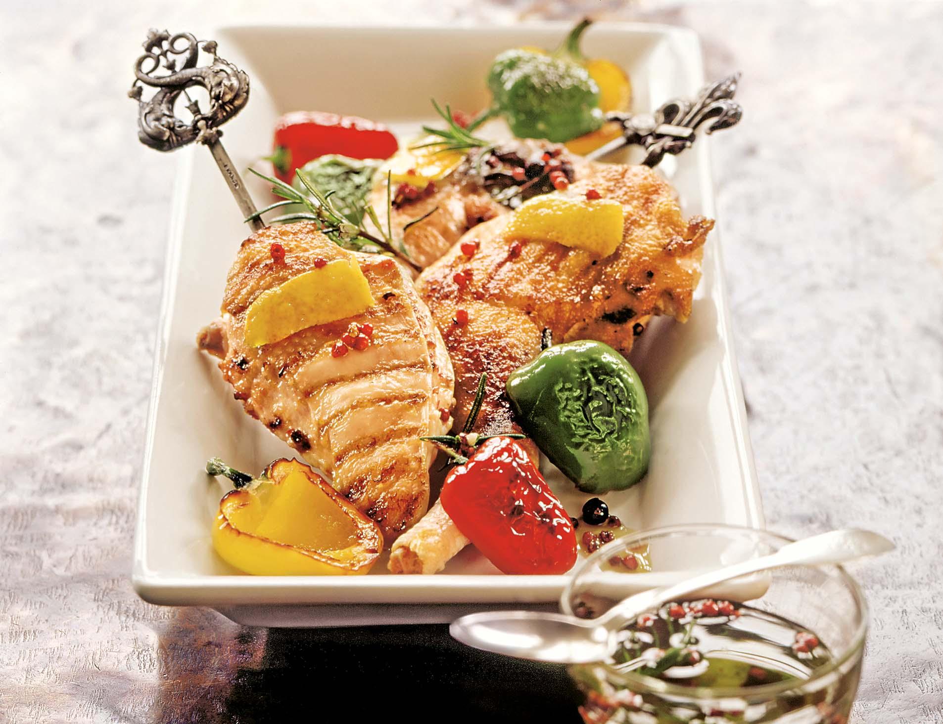 4. Стручки перца вымыть и обсушить. Смазать оставшимся оливковым маслом и запечь на гриле. Филе индейки насадить на шпажки и также обжарить на гриле. Подать вместе с запеченным сладким перцем.