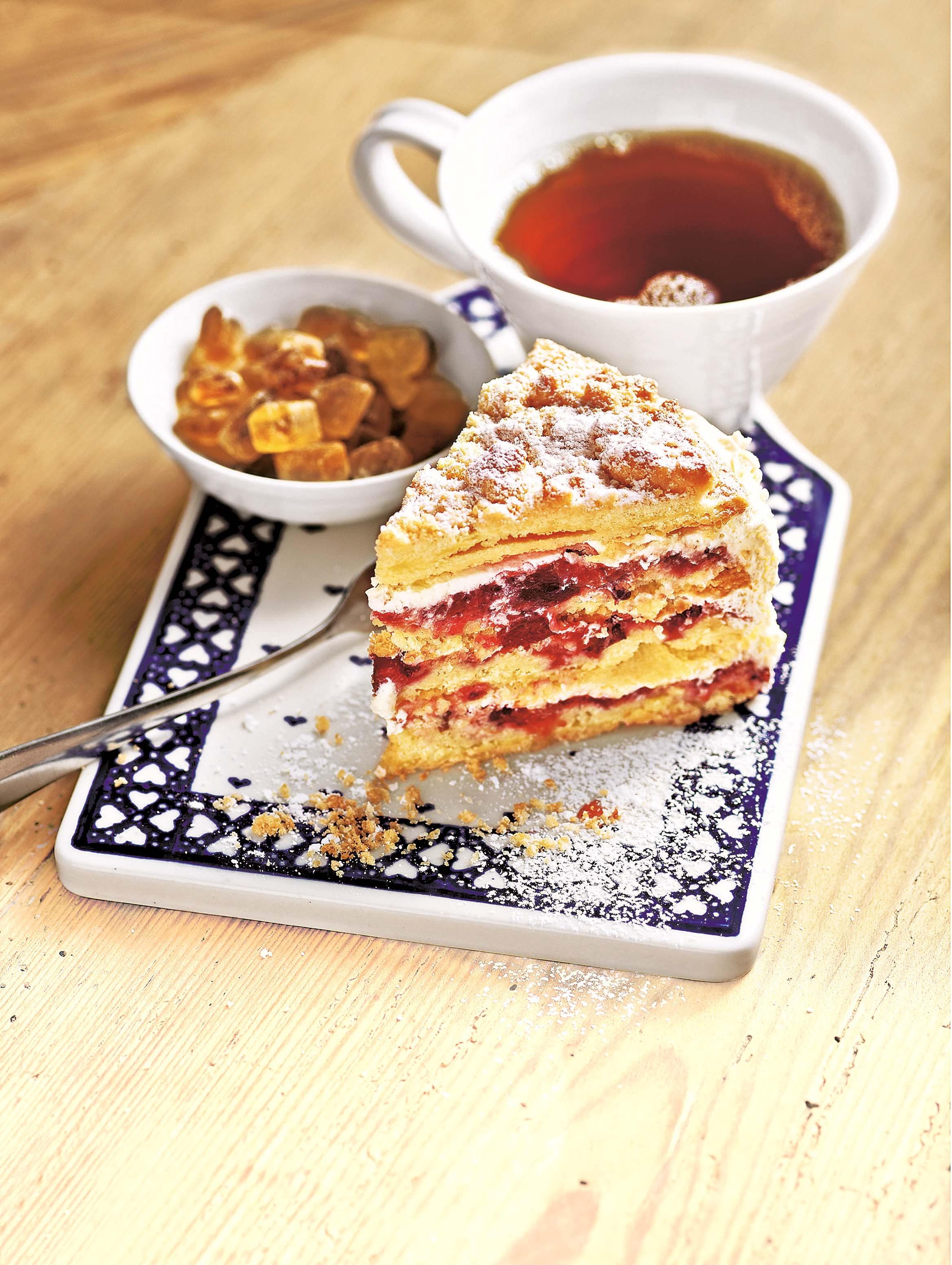 5. Для крема сливки взбить с ванильным сахаром и загустителем. Коржи сложить друг на друга, прослаивая кремом и начинкой. Убрать в холодильник на 2 ч.