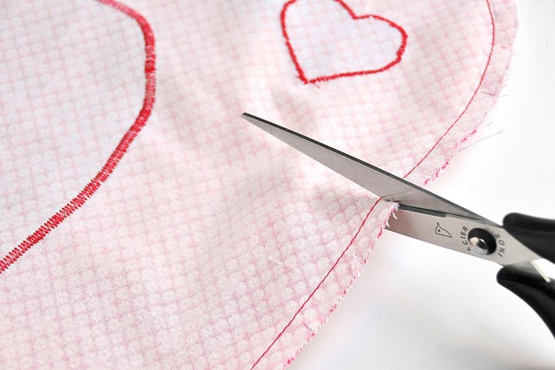 5. К яблокам прикалываем иглами сердечки, сместив их от центра. Притачиваем сердечки по контуру мелким зигзагом.