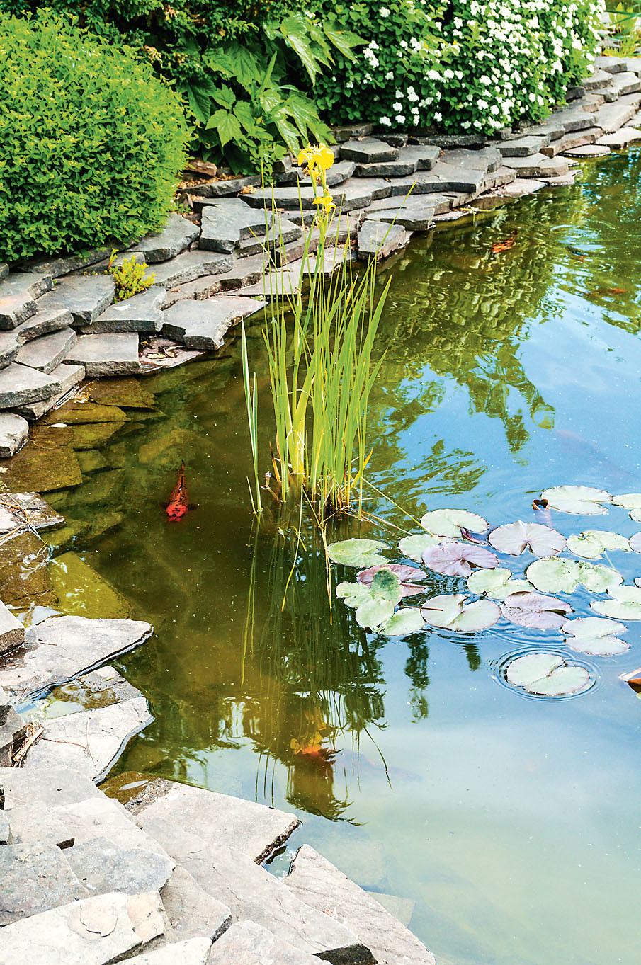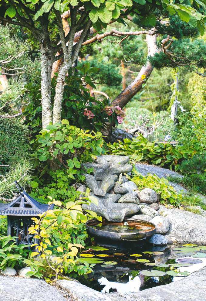 На поверхности «воды» из гравия или песка граблями наносят извилистые линии–волны, а из гальки среднего размера выкладывают «сухие ручьи», по берегам которых располагают более крупные камни. Ширина «ручьев» – величина непостоянная, сухое русло с многочисленными изгибами то сужается, то расширяется. Для полноты картины через него стоит перебросить мостики, внешний вид которых может быть весьма разнообразным: несколько толстых досок, изящная конструкция с перилами и даже крупные плоские камни. Но «сухие» ручьи не заменят настоящую воду, которая присутствует в японском саду в самых разных проявлениях. Например, неглубокий прудик, маленький фонтанчик, живой звонкий ручеек или же большая каменная чаша, наполненная водой.