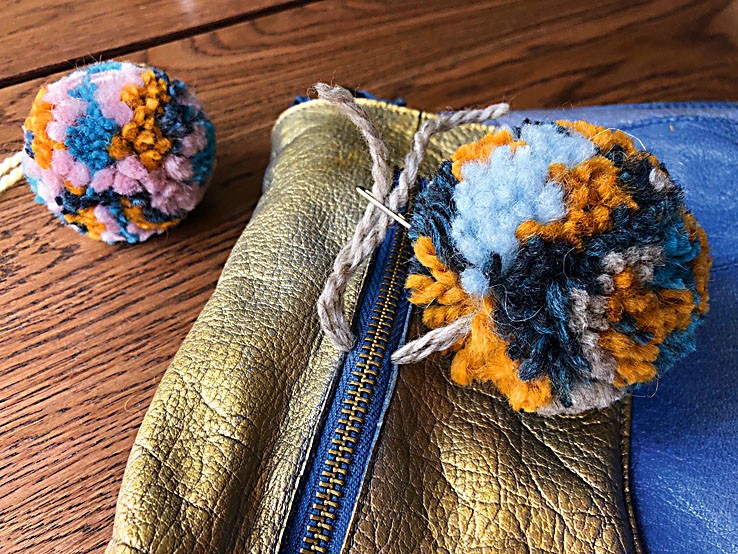 Готовые помпоны размести и закрепи на сумке с помощью иглы и ниток в задуманном порядке. Мы, к примеру, пришили их на верхний клапан, чтобы спрятать неработающую молнию.