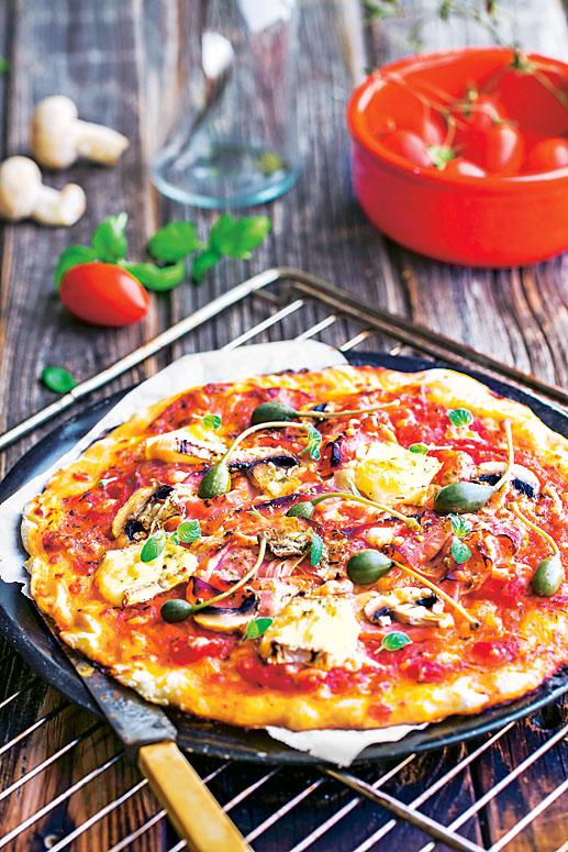 На 2 порции: • 12 г свежих дрожжей • 125 г безглютеновой мучной смеси • по щепотке сахара и соли • 1 ст. л. оливкового масла • 60 г каперсов • 80 г шампиньонов • 200 г сыра • 80 г ветчины • 4 ст. л. томата-пасты
