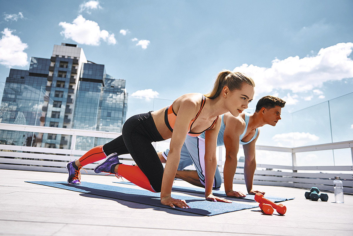2. Альпинист. Встать в планку на руках, ладони под плечами. Подтянуть живот, напрячь мышцы ягодиц и пресса. Тело должно образовывать прямую линию от головы до пяток. Затем подтянуть правое колено к груди, при этом напрячь мышцы пресса еще сильнее.