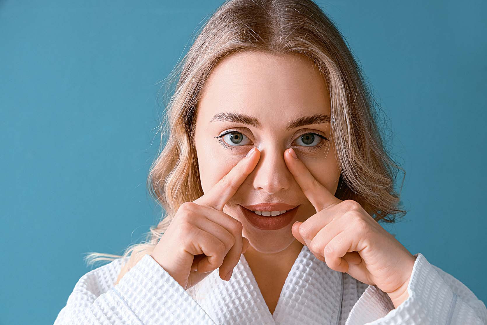 Закрой глаза и мягко прижми пальцами веки. Открывай глаза, преодолевая сопротивление, несколько раз. Подними взгляд наверх, надави средними пальцами на внутренние уголки глаз, указательными — на внешние. Ты должна будто подтягивать нижнее веко вверх, ощущая легкое напряжение.
