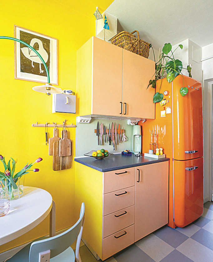 - На кухне хорошо смотрится жизнерадостная гамма, например, сочетание желтого или персикового оттенков. Это пробуждает аппетит.