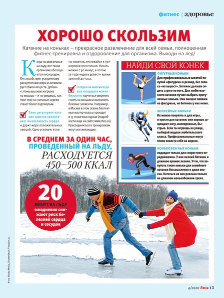 В«Лизе» №4 я увидела советы для тех, кто катается на коньках, и решила поделиться своими впечатлениями от нынешней зимы. Снега у нас в Москве толком не было ни в декабре, ни в январе. Мы с мужем просто не знали, чем занять детей на прогулке! Обычно мы ходим в парк, дети катаются с горок на «ватрушках». Иногда мы устраиваем лыжные вылазки. Но из-за аномального тепла лыжи скучают на балконе, а мы выходили в парк с самокатами – и это зимой! Потом нашли другое развлечение. Недалеко от нашего дома есть каток, который работает даже при плюсовой температуре. Раньше дочка не хотела на каток – у нее не получилось с первого раза красиво скользить по льду, она и капризничала. Но когда вся семья встала на коньки, пришлось и ей подтягиваться. И сейчас она катается даже лучше старшего брата. Наталья, г. Москва