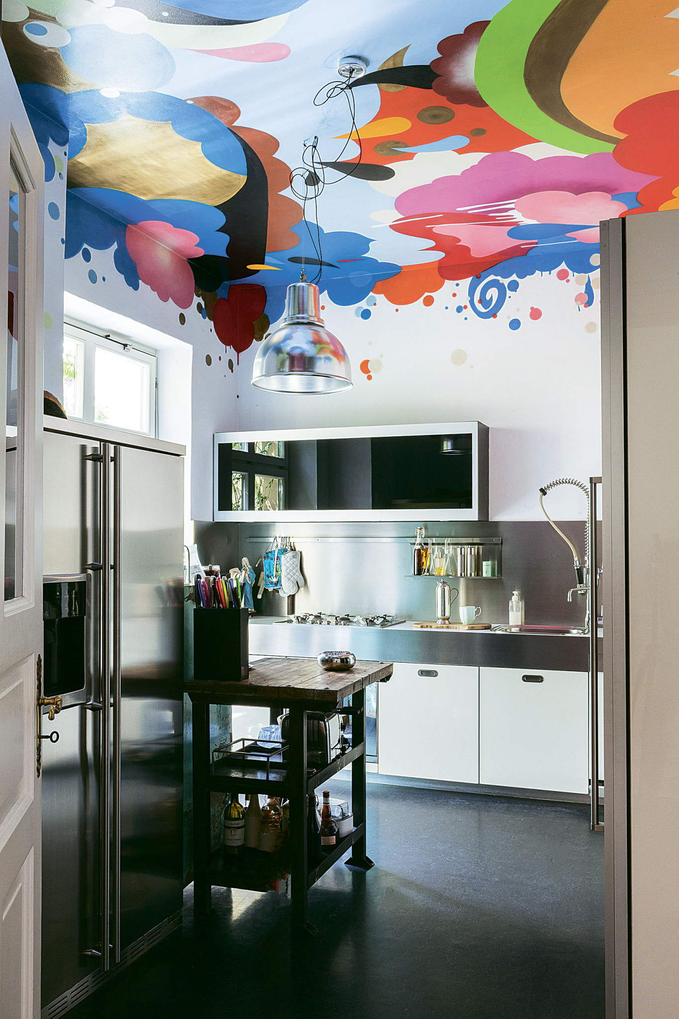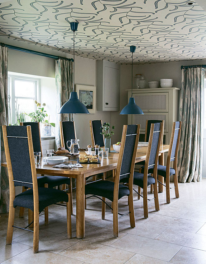 Идея покрасить потолок в яркий цвет постепенно становится все менее экстравагантной. Тут главное – не прогадать с оттенком. Если потолки низкие, лучше сделать окрашивание с разницей в несколько тонов, без резкого перехода. А вот если высота потолков позволяет, можно решиться на смелый контрастный оттенок – получится очень эффектно. Только обязательно поддержи выбранный цвет в палитре основного интерьера: например, продублируй в декоре или текстиле, отдельных предметах мебели.