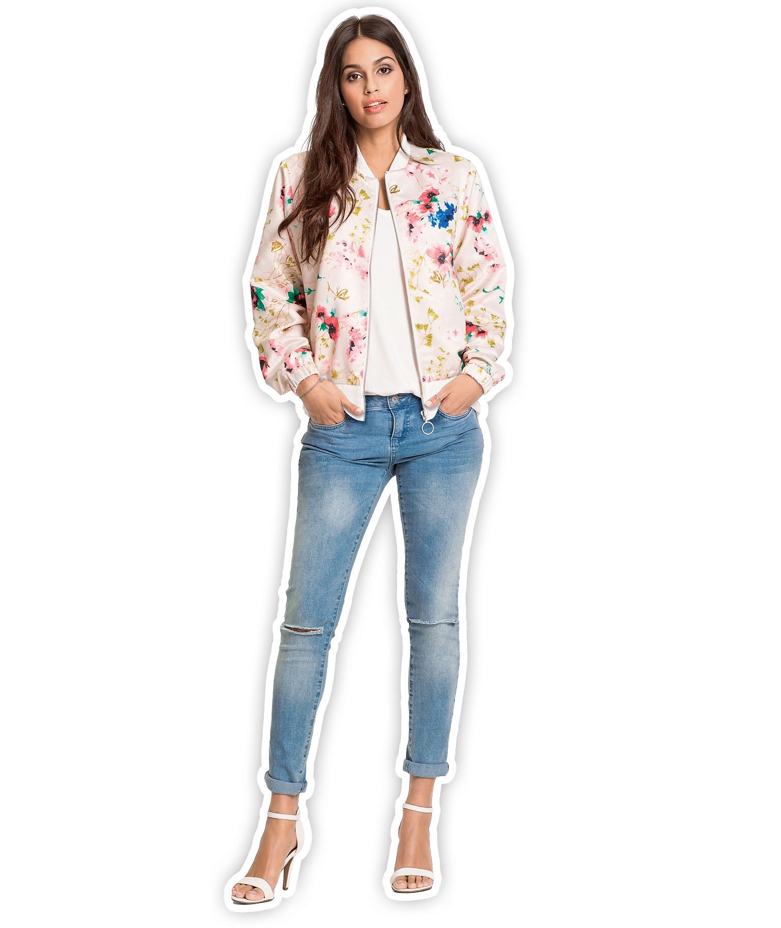 Светлая куртка с цветочным узором красиво дополнит голубые летние джинсы. А белые босоножки на каблуке сделают образ женственным.