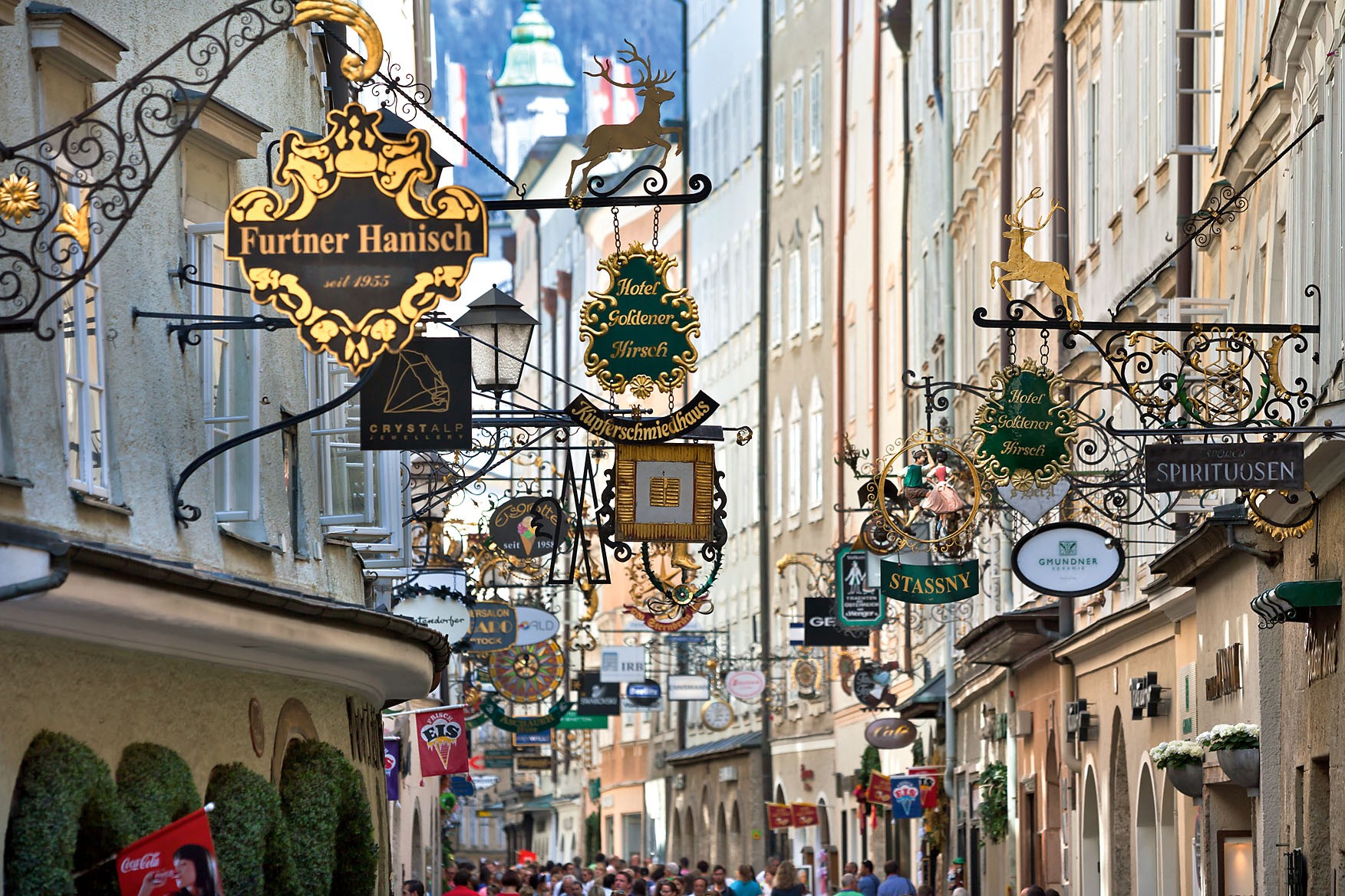 Главная и самая нарядная улица в Зальцбурге. Когда-то давно городские власти распорядились, чтобы все лавочки на улице имели красивые вывески, причем в одном стиле. Сегодня это требование сохранилось, исключений не делают даже для международных брендов. Знаменитой сети ресторанов быстрого питания также пришлось вставить свою фирменную букву в кованую вывеску с позолотой.
