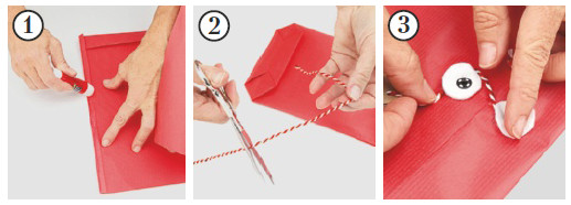 3. Сделай из бумаги 2 круглые пуговицы, приклей их на конверт и клапан. Помести внутрь подарок и обвяжи пуговицы шнуром.